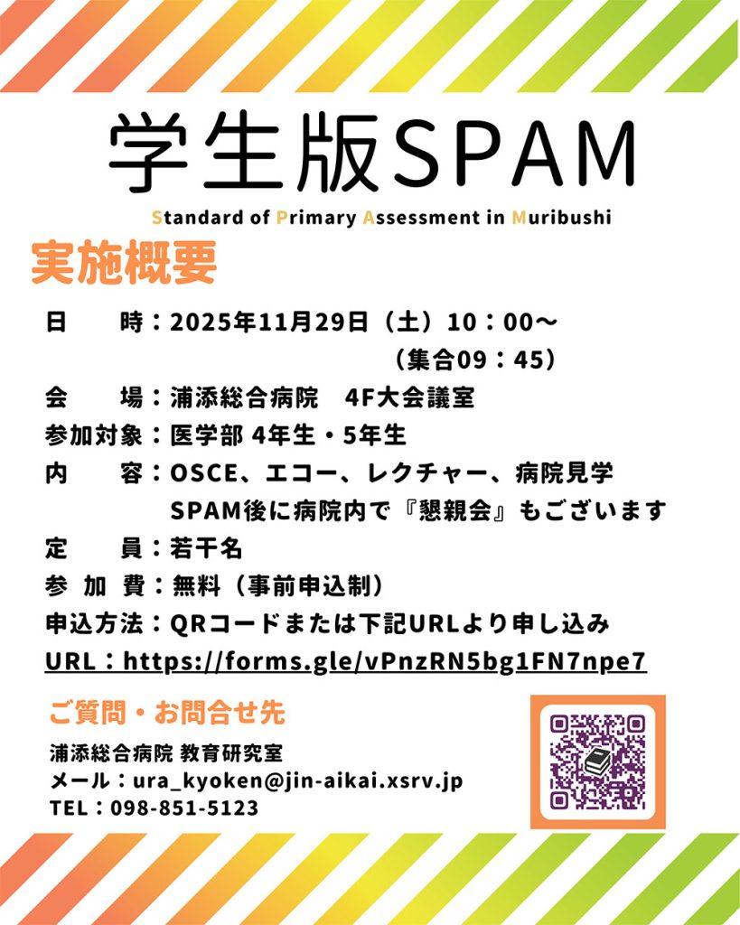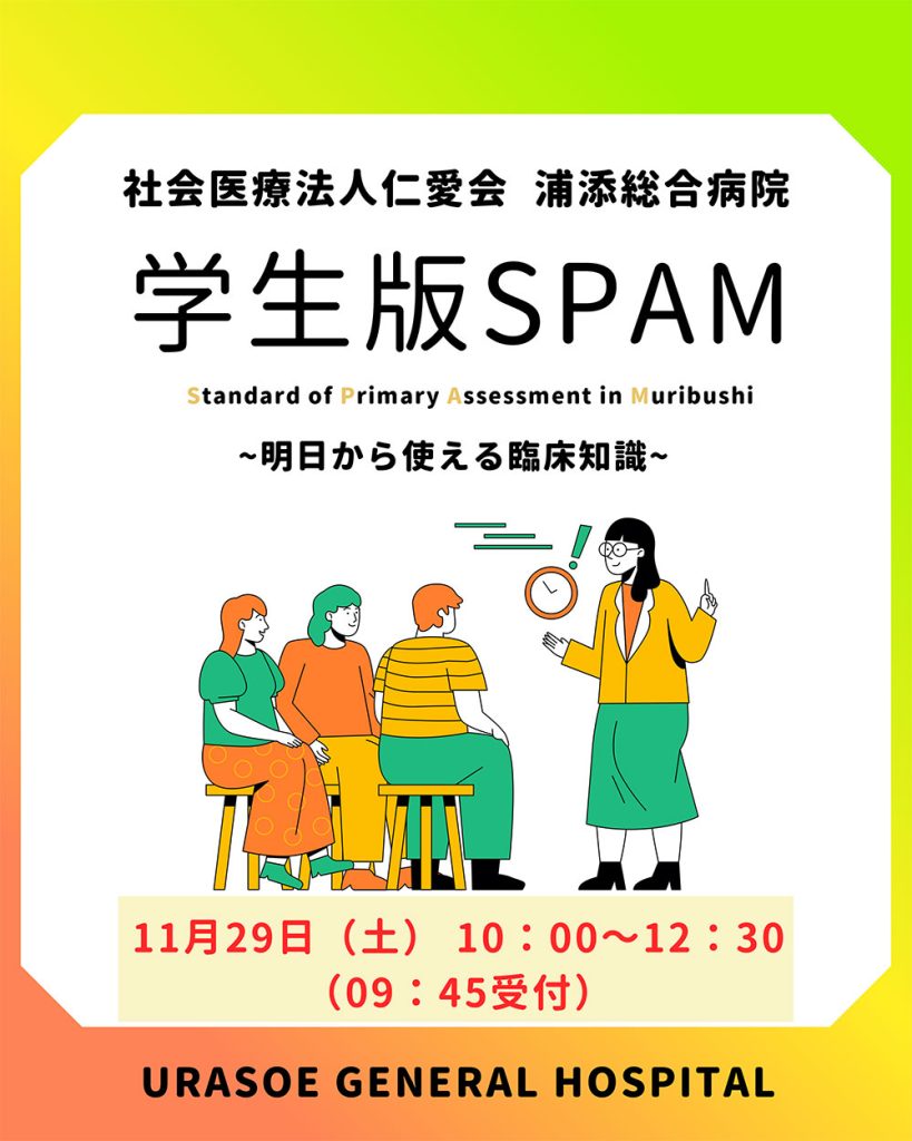 ※SPAMとは、”Standard of Primary Assessment in Muribushi”の略で、研修医がERで自信を持って救急初期対応に臨めるよう、浦添総合病院で産まれた救急初療標準化コースです。