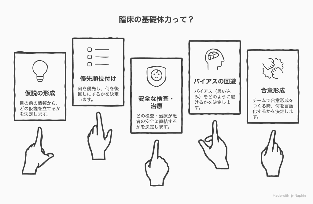 ・不確実性への対応:情報が限られた状況でも、臨床推論の筋道を立て、患者の安全を守り抜く