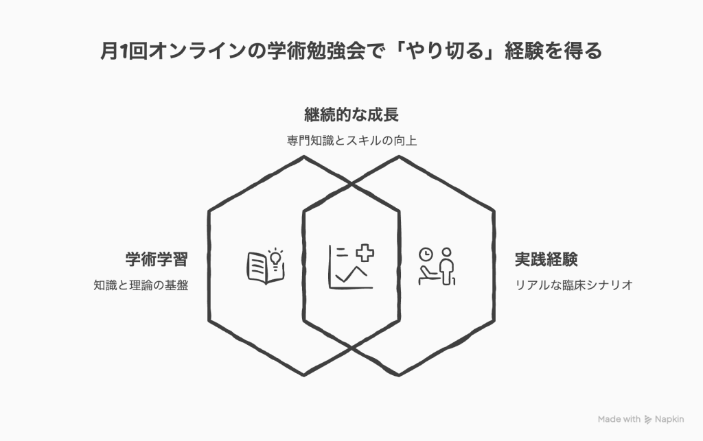 むりぶし総診では、月1回のオンライン学術勉強会を設け、症例報告から臨床研究まで、“形にするプロセス”そのものを支援します。