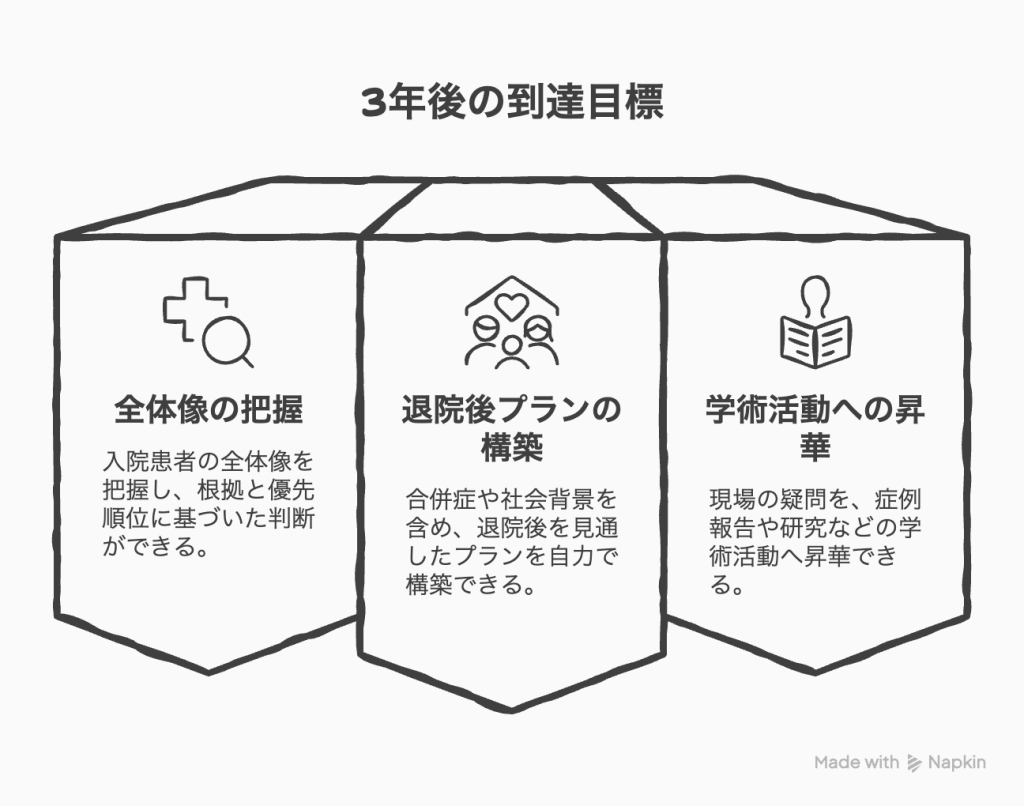 病院という組織の中で、医療の「質」と「流れ」をデザインし、現場を前に進めることができる医師。入院診療を軸に、診断・治療だけでなく、意思決定の整理、多職種連携、退院支援、安全と質の改善までを一貫して担える医師、その総合力を3年間で鍛えます。